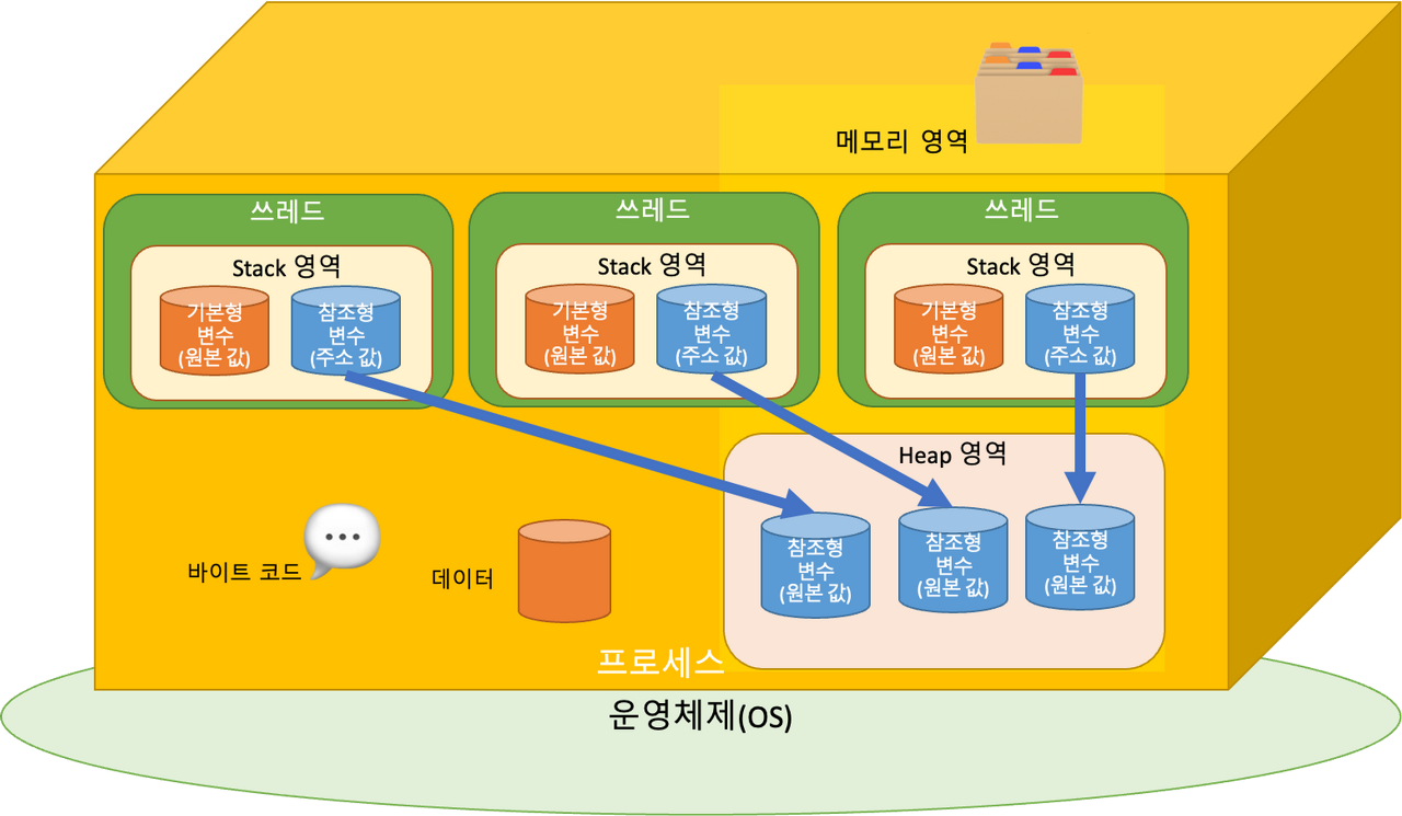 - 추가로, 쓰레드(일꾼)들은 각각 명령처리를 위한 자신만의 메모리공간(Stack)도 할당받는다.