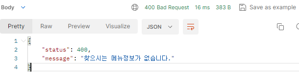 1. 오늘 Menu클래스의 기능을 모두 완성했다. Menu 클래스는 ADMIN 권한이 있어야만 생성 수정 삭제가 가능하며, 조회는 권한 상관없이 토근만 가지고 있다면 가능하도록 기능을 구현했다. 조회를 제외한 테스트를 진행하면서 데이터를 조회하기 전에 USER가 ADMIN권한을 확인하는 로직을 수행하는데 여기서 ADMIN 권한이 없을때 IllegalAccessException처리를 통해 에러를 GolbalException으로 전달후 처리하는데 테스트 내내 Httpstatus는 403 Forbidden 출력되지만 설정한 객체로 status의 value값과 message가 출력이 돼야하는데 아무것도 출력이 되지않아서 디버깅하면서 처리되는 경로를 찾아봤지만 너무 복잡한 과정에서 처리가 되는 부분이 있어 시간상 처리를 하지는 못했지만 GlobalException에서 처리를 하기 위해선 추가 조치가 필요해 보인다.