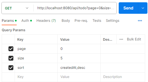 Controller를 보면 단순하게 Pageable의 데이터와 User의 정보만 받는 것을 확인할 수 있다. @RequestParam으로 원래 개별적으로 page, size, sort에 대한 정보를 받아야 하지만 Pageable을 설정하면 따로따로 입력받을 필요 없이 아래의 POSTMAN처럼 간편하게 입력을 받을 수 있다.