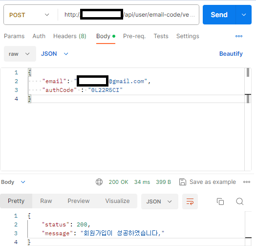3. 2번에서 EmailService클래스에 있는 sendMail메서드를 실행하고 나서 이메일로 받은 인증코드를 통해 바로 이메일 인증을 진행하면 된다. 인증 절차를 마치면 verifyCheckFlag 체크를 통해 알맞은 Response를 반환한다.