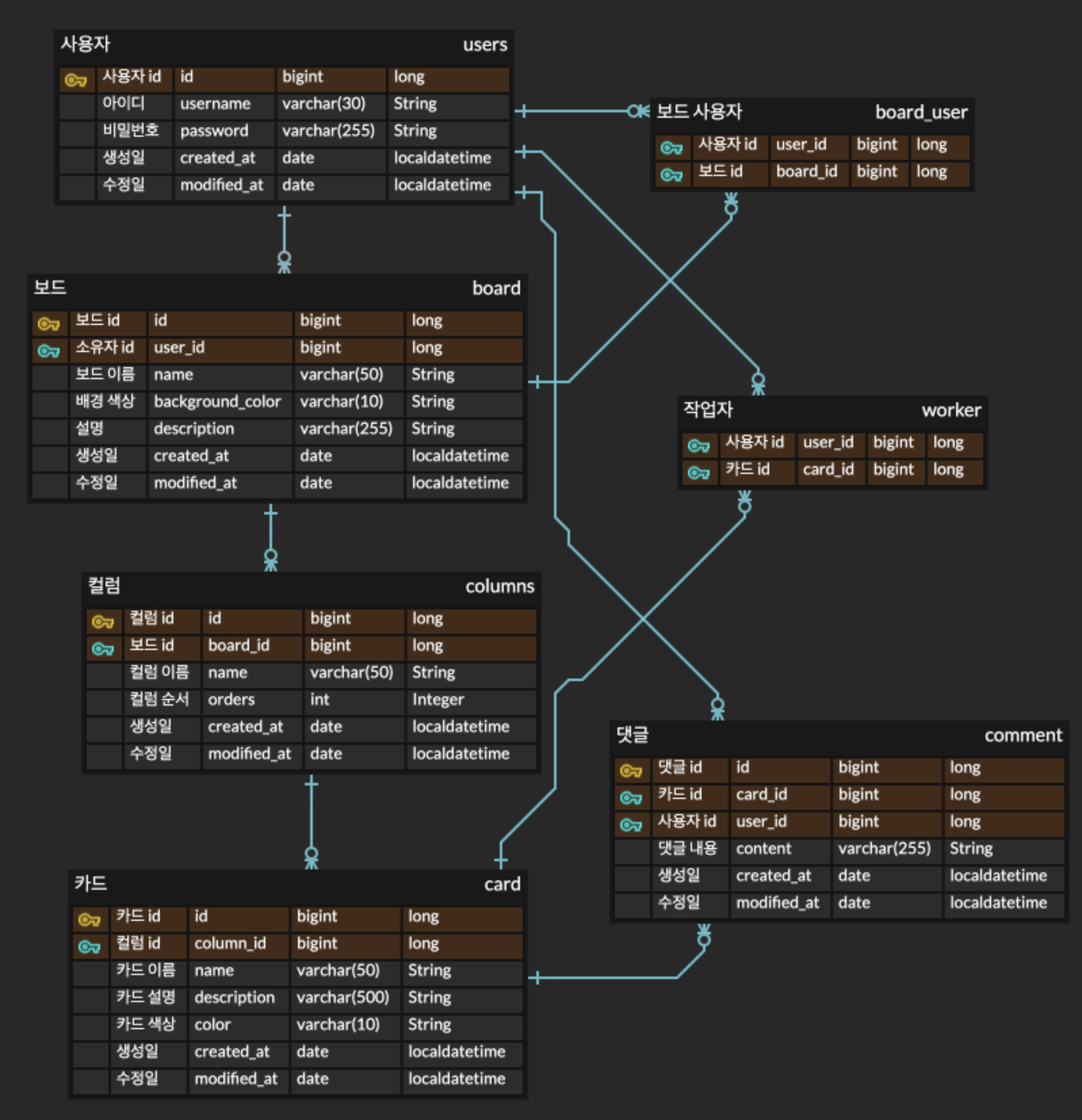 trello자체가 보드를 생성하면 칼럼을 생성가능하고 칼럼 안에서 여러 개의 카드를 생성할 수 있다. 따라서 연관관계도 보면 보드를 따라서 쭉 아래로 연관관계가 설정 돼있는 것을 확인할 수 있고 또한 다른 유저를 초대가 가능하기 때문에 초대기능을 위해 board_user의 Entity를 복합기로 생성하여 정보를 가져오는 방식으로 제작했다. 또한 카드 생성 시 작업자를 쉽게 파악하기 위해 복합기를 한 번 더 설정하였다.