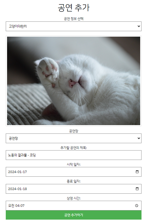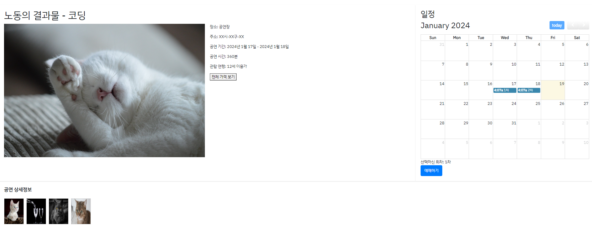 백오피스의 6개의 페이지 중에서 2개의 페이지를 구현했고 잘 동작하는 것까지 확인했다. 2개의 페이지를 구성하고 마지막으로 팀원과의 의견 조율을 통해 공연 조회 페이지 구현을 담당했다.