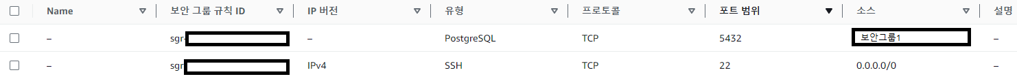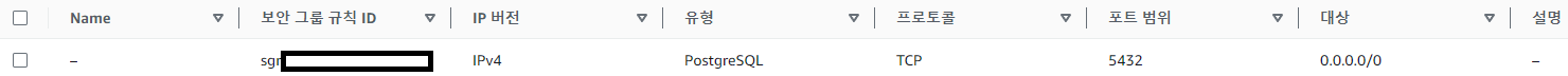 아웃바운드: 5432 모든 IP (0.0.0.0/0)로 나가는 트래픽을 허용