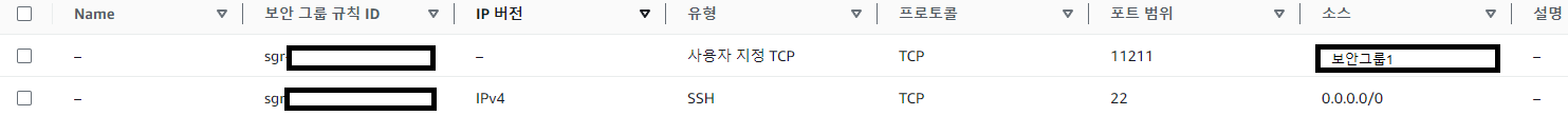 인바운드: 22(SST), 11211(memcached): 보안그룹 1에서 접근 허용